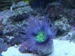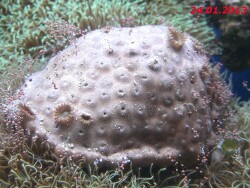 Zum entfernen: Den Stein habe ich aus dem Becken genommen (zum Glück hatte ich noch keine Korallen verklebt). Nach 15 min. Überlegen wie ich den Kerl da raus bekommen kam mir die Idee einfach das Loch wo er sich versteckt hat, mit Leitungswasser zu spülen. Das fand er nicht so toll und kam aus seinem Loch.