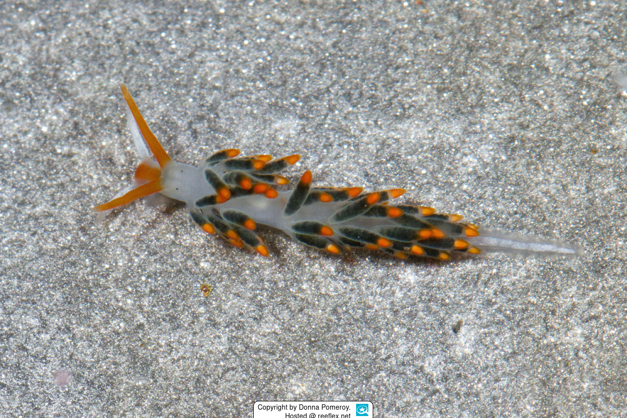 The ground colour is translucent greyish-white to cream. On the head is a large, rhomboidal, orange-red blotch. Rhinophores are orange, cerata with orange tips, oral tentacles are opaque white. A median line on posterior foot, dark, usually black ceratal (vary from ochre to almost black) digestive gland duct.