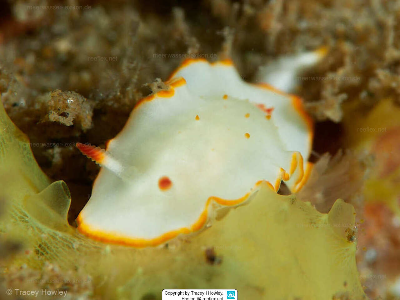 Diversidoris aurantionodulosa is white or yellow with a thin orange border and low rounded tubercles each tipped with orange. The rhinophores are white with orange tips and there is an orange line up the outside of each white gill.