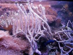 The pumps should be switched off before feeding. In order for the gorgonian to survive in the aquarium, each individual polyp must be fed sufficiently, i.e. daily or 3-4 times a week. Without feeding, the gorgonian will not survive in the aquarium. The polyps need a certain amount of time to absorb the food (granules or dust food (Ultramarin, Cyclop Eeze) or frozen food (lobster eggs, mysis)). If shrimp and fish are present, they will try to steal the food, so it is essential to feed these cohabitants beforehand.