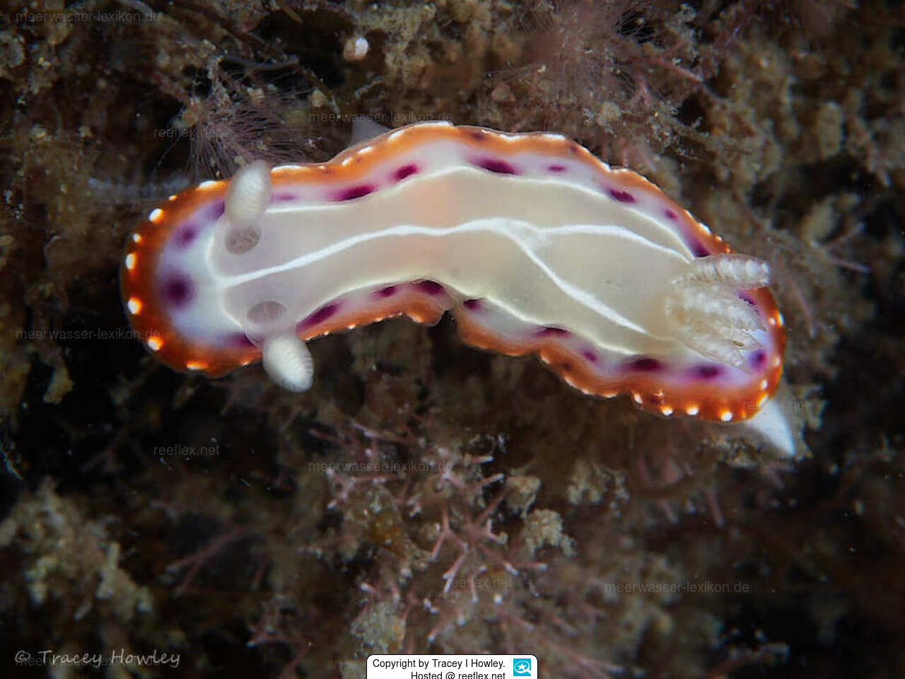 Goniobranchus setoensis have a translucent greyish body. The mantle margin is orange-brown with large purple spots and small white dots.In the middle of the boddy is a Y-shaped opaque white line.